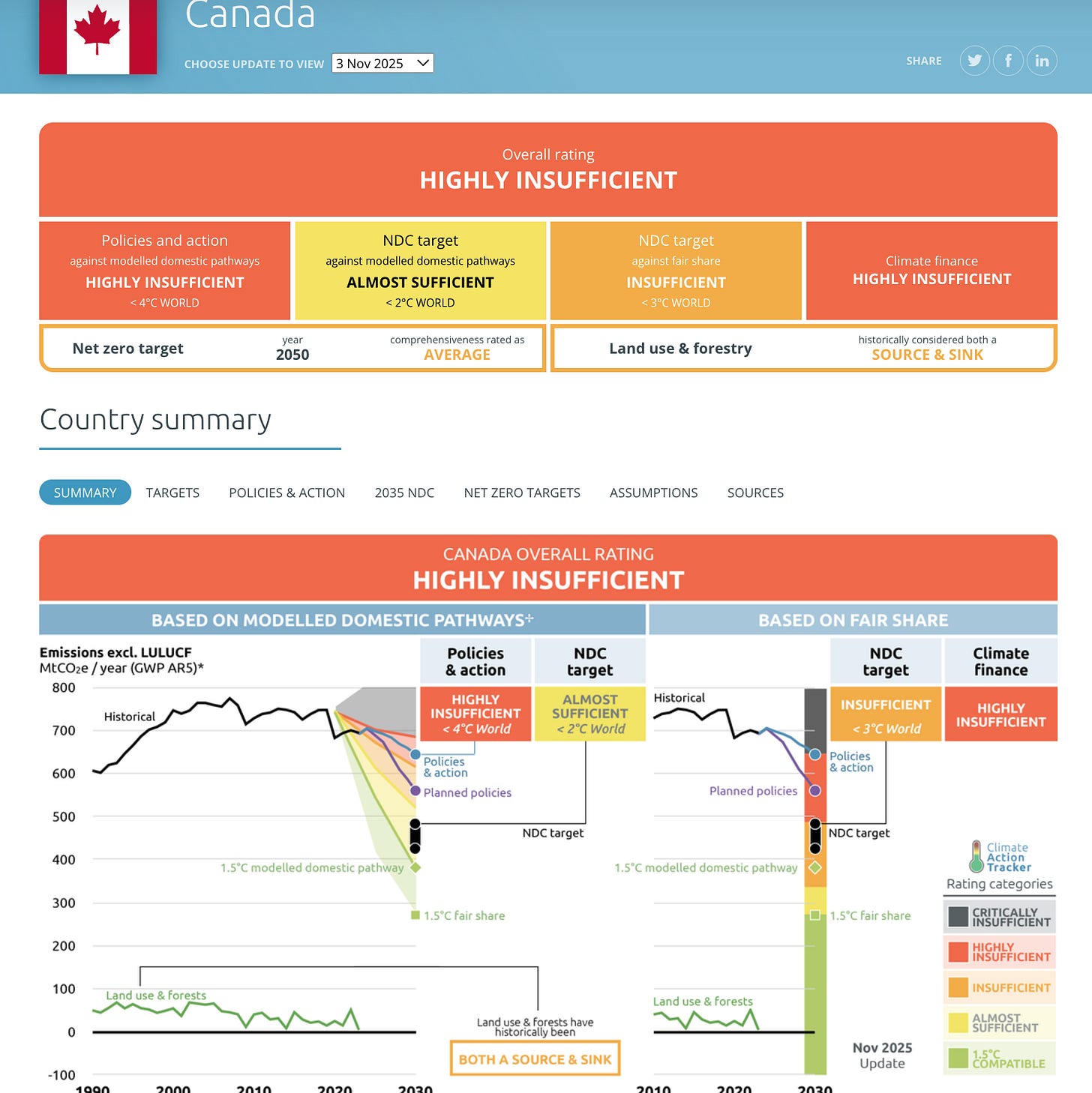 As will be examined below, the Canada-Alberta MOU weakens and revises many of the 2030 Emission Reduction Plans’ measures and makes the achievement of its goals highly unlikely. But these goals are themselves insufficient in terms of Canada doing its “fair share” in reducing GHG emissions for the purpose of achieving the Paris Agreement objectives of keeping global warming to 1.5º Celsius. The Climate Action Tracker, a highly regarded platform that tracks national and global policies against the Paris Agreement goals, reports that Canada’s NDC targets in terms of Canada’s “fair share” is “insufficient,” and is actually consistent with a global trajectory towards a relatively catastrophic 3º C increase by 2100. What is more, it determined that based on national policies and action (as opposed to its pledges)—prior to the announcement of the Canada-Alberta MOU—Canada’s climate posture was “highly insufficient” and consistent with a global trajectory of a dystopian 4º C increase by 2100.